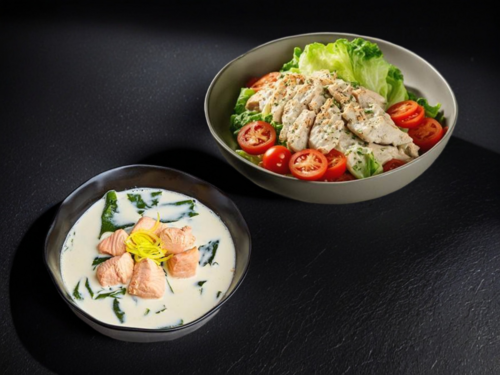 Сливочный суп с лососем + Цезарь с курицей