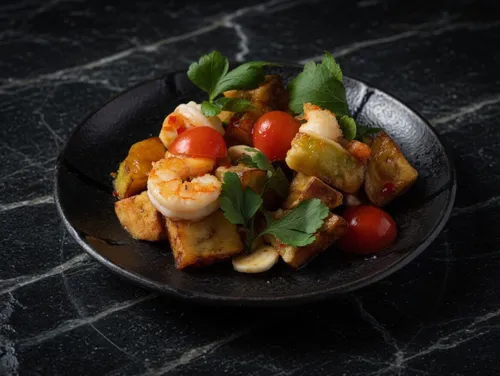 Салат с хрустящим баклажаном, свежими томатами, жаренными креветками, заправленный сладким чили соусом с добавлением кинзы и мяты