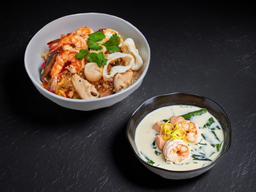 Рис с морепродуктами + Сливочный суп креветкой и лососем