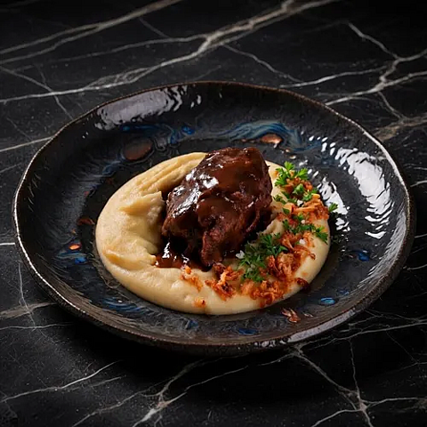 Телячьи щечки под соусом демиглас с картофельным пюре